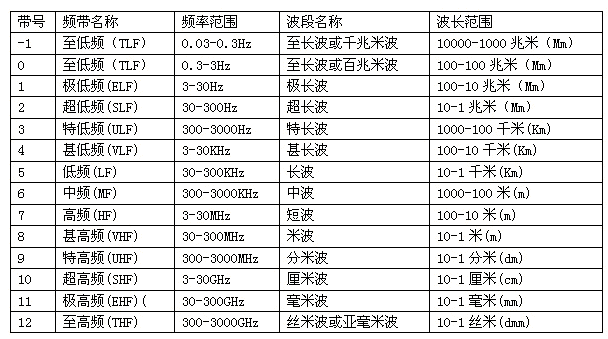 目前,根椐《中華人民共和國無線電頻率劃分規(guī)定》,我國已對9K~1000GHz頻帶內(nèi)的無線電業(yè)務做出了規(guī)劃,對無線電頻帶和波段也做了命名(見表1)。